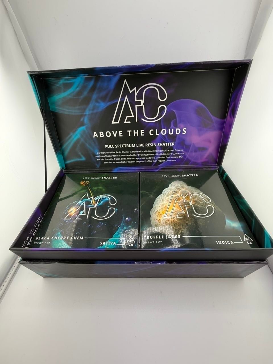 Each gram of Above The Clouds Live Resin Shatter comes sealed in high-grade parchment paper inside a durable, child-resistant glass jar or clamshell, depending on edition. The outer box is sleek, holographic, or embossed, exuding elegance and premium appeal. Every package is lab-tested and batch-stamped, giving consumers transparency and confidence in what they’re consuming.